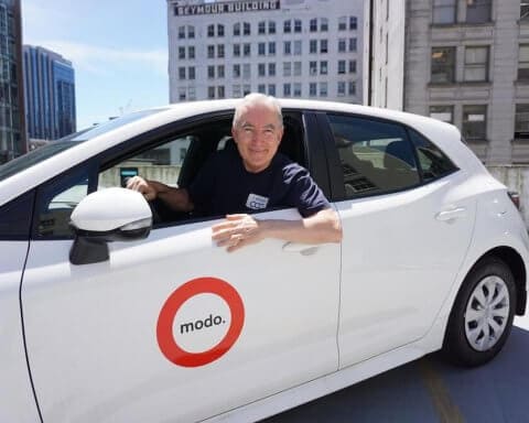 Tucked in the corner of Patrick Nangle’s spartan Modo car-sharing office, with its pale walls and light-brown wooden desk, is a black