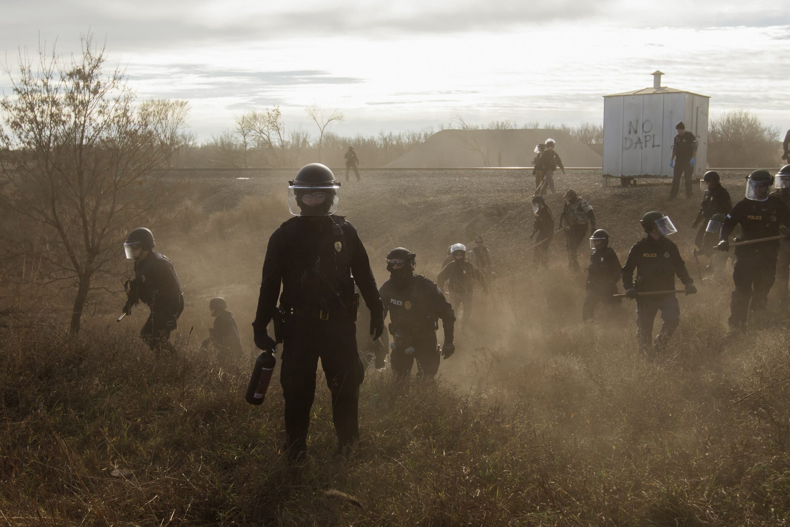 Morton County Sheriffs - Riot police clear marchers from a secondary road outside a Dakota Access Pipeline worker camp using rubber bullets, pepper spray, tasers and arrests in 2016. Photo by Amber Bracken.