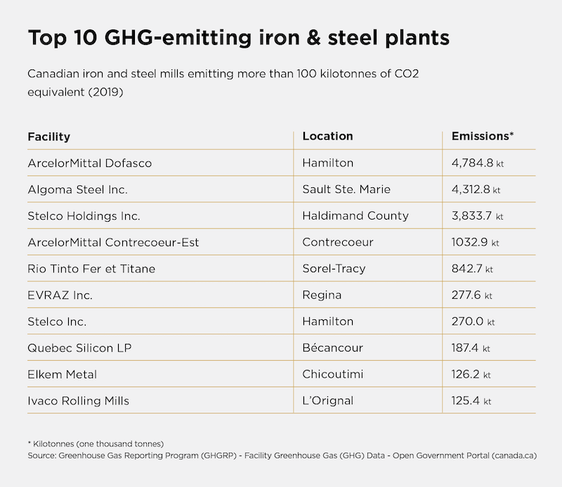 These processes take a heavy toll on the climate. The steel industry is responsible for about 7% of global CO2 emissions. In Canada, steel’s share is less because of the huge carbon footprint of our oil and gas industry. Nevertheless, in 2019, steel accounted for 16 million tonnes of CO2, 2% of Canada’s total greenhouse gas (GHG) emissions.