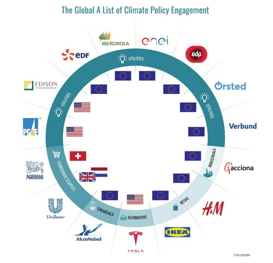 The report says that the dominance of European companies on the list “likely corresponds with the leadership of the EU on climate. The relative support for ambitious climate policy by the corporate sector in the EU and U.K. goes a long way to explain the policy gap since the Paris Agreement between European countries and regions such as the US, Japan, Australia, and Canada.”