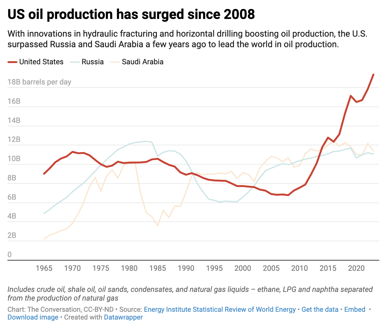 That production has both pros and cons. Together, oil and gas account for nearly three-quarters of U.S. energy consumption. Producing oil and gas in the U.S. provides energy security, and high production generally keeps prices down. Burning oil and gas, however, releases carbon dioxide into the air, contributing to climate change. And natural gas is mostly methane – another potent greenhouse gas.