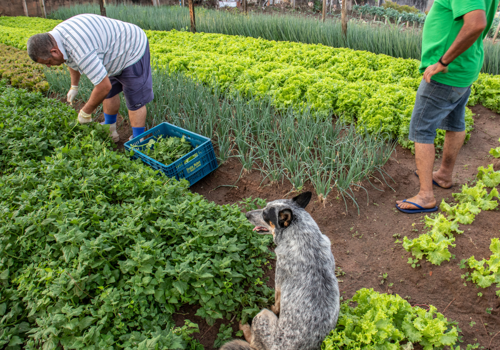 A family farmer harvests chives, lettuce and spinach in the state of São Paulo, Brazil. Photo by Alf Ribeiro.