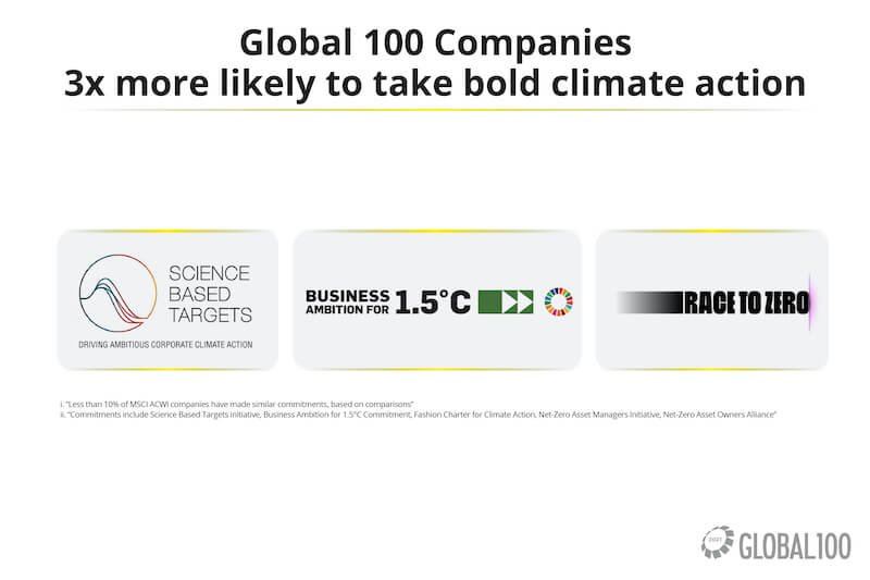 Notably, 60 of the Global 100 companies have signed on to the Science Based Targets Initiative to reduce their emissions in line with a 1.5°C future.