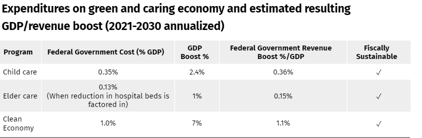 How are we going to pay for it? We can issue bonds today that will be directed at investments in affordable child care, long-term care for seniors and a green recovery, and we can afford to do it without raising tax rates. We can do this because these programs stimulate economic activity that will generate future government tax revenue that will be greater than the interest on the bonds.