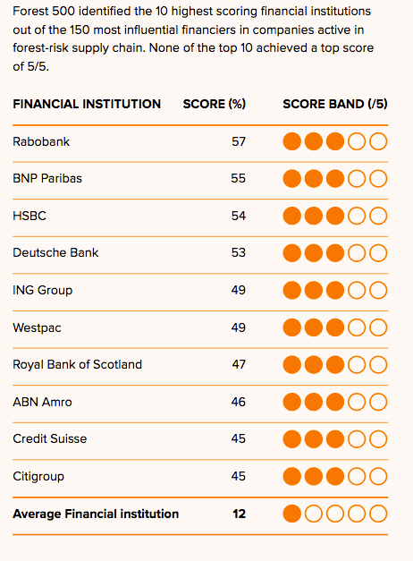 But if forests keep falling, is anyone held accountable? Global Canopy’s annual Forest 500 ranking has been keeping track of the 350 most influential corporations and 150 financial institutions in forest-risk commodity supply chains (linked to palm oil, soy, cattle and timber products). It concludes that while every year the number of companies making commitments rises, there’s a serious implementation gap. According to the report, “Even companies with ambitious commitments are not putting these into practice.”