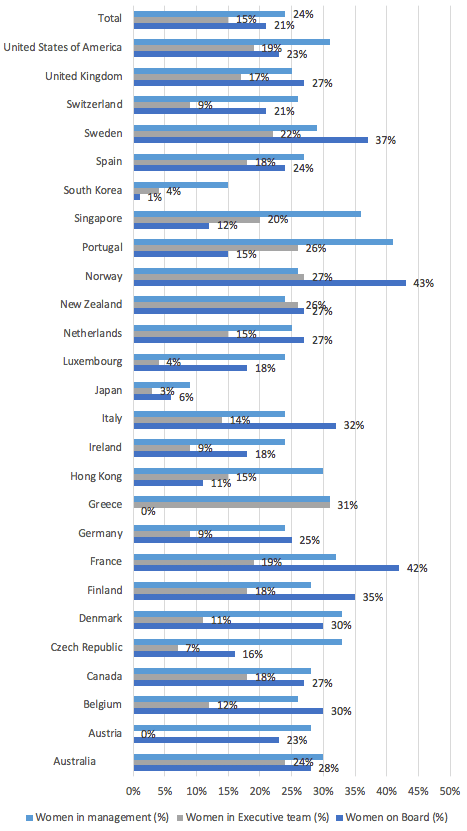 To be blunt, Canada doesn’t fare well in LeaderXXchange’s global rankings conducted. First, LeaderXXchange only focuses on the largest publicly-traded companies in North America; it doesn’t rank the entire public company universe. However, it’s pretty clear from LeaderXXchange’s research that Canadian companies are more closely correlated to their American neighbors than they are to Australia (which has a similar industry base to Canada). While 93% of Canadian companies adopted gender policies, just 20.5% of board directors are women(versus 32.5 % in France). While three quarters of French companies disclose the number of women in management, only 31% of Canadian companies do (for more details on the Canadian scene read Don’t Fear the Gender Quota).
