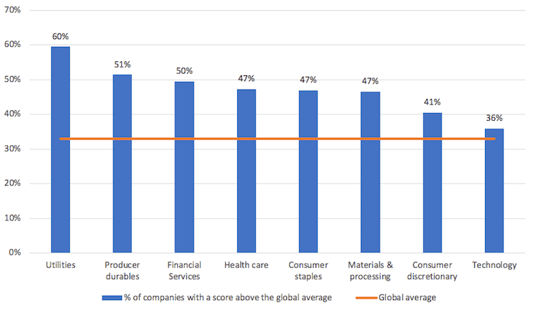 Sectors can and do change. Once a notorious “boys club,” the financial sector now has the largest number of companies that outperform LeaderXXchange’s median score. What gave? For one, L’Helias points out that the 2008 financial crisis created a crisis of confidence. Investors and regulators used their new leverage to focus on improving the industry’s governance, particularly the banking industry. Employees and clients were also adding pressure.