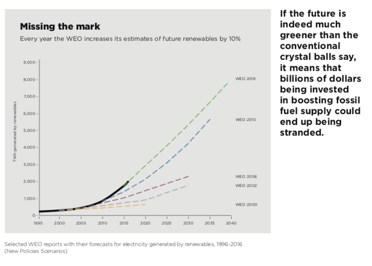 If the future is indeed much greener than the conventional crystal balls say, it means that large chunks of the hundreds of billions of dollars being invested in boosting fossil fuel supply (US$715 billion in 2017) face grave risks of being stranded assets, as they are displaced by the quickening march of renewables and electrification.