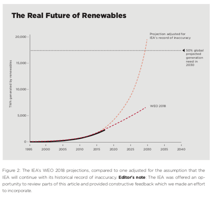 So unnervingly consistent is the IEA’s underprediction of renewables, it can itself be predicted. And so, before WEO 2018 was launched in Vienna last November, with speeches by former UN Secretary General Ban Ki Moon and IEA executive director Fatih Birol, I scribbled down a prediction for what they would say.