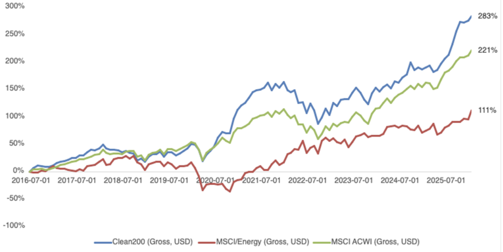 Over the past decade, investors in Clean200 companies beat the benchmark by a wide margin. From July 1, 2016, to January 26, 2026, the Clean200 portfolio returned 282.9%, compared with 221.3% for the MSCI ACWI. The fossil fuel benchmark, meanwhile, returned a much slimmer 111%. In other words, the Clean200 produced about 2.5 times the gain of the fossil fuel benchmark.