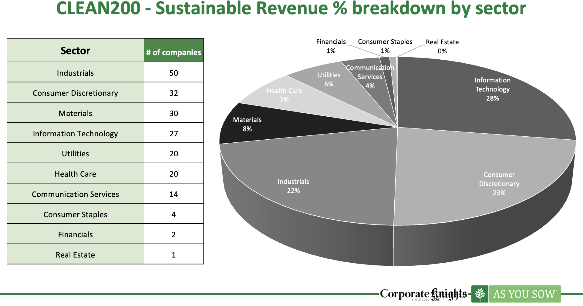 The Clean 200 is selected from 8,229 eligible companies, of which 103 were excluded. The list employs a wide range of negative screens to exclude: for example, fossil-fired utilities or big banks and insurers financing fossil fuel companies, as well as for-profit prisons, weapons makers and others.