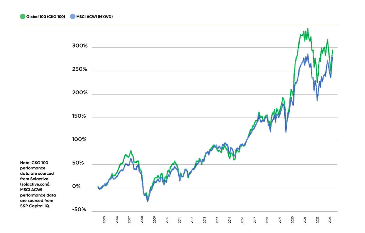 3. Financially speaking, the Global 100 index has stood the test of time, outperforming its benchmark over the past two decades. It has posted a 295% total return since its inception in February 2005 to the end of 2023 (versus 278% for the MSCI ACWI).