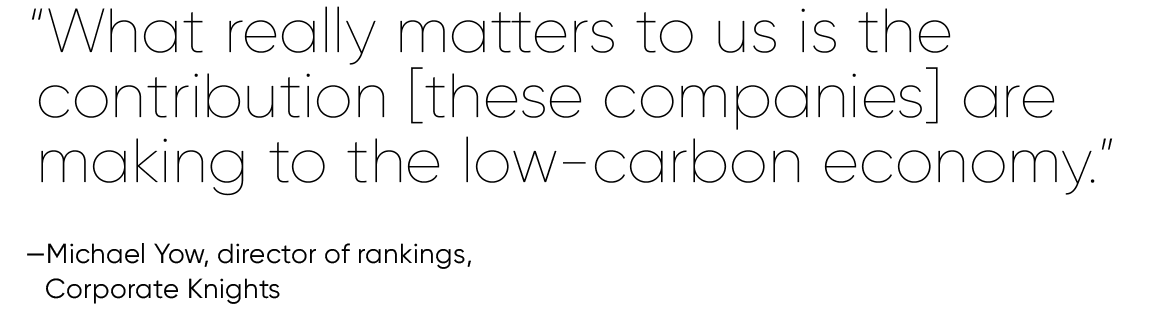 “What really matters to us is the contribution [these companies] are making to the low-carbon economy,” says Michael Yow, the director of rankings for Corporate Knights. According to Yow, the new streamlined methodology at once simplifies and standardizes reporting while differentiating the rankings from other international lists.