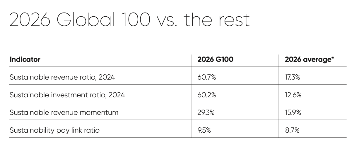 | Rank 2026 | Rank 2025 | Company | Country | Peer group | Sustainable revenue momentum | Sustainable revenue ratio | Sustainable investment ratio | Letter grade |