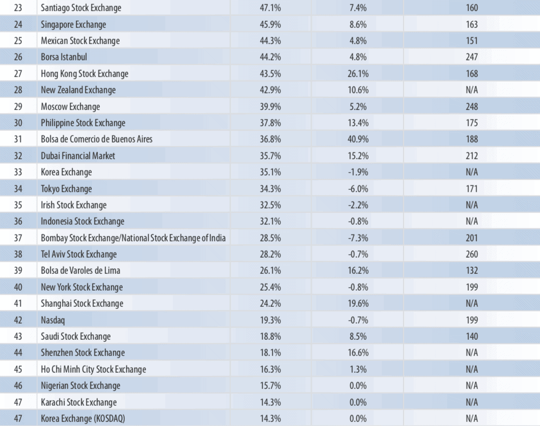 BME Spanish stock exchanges and Euronext Paris kept their places in the top five, with Euronext Lisbon and Johannesburg Stock Exchange emerging as newcomers to the top five.