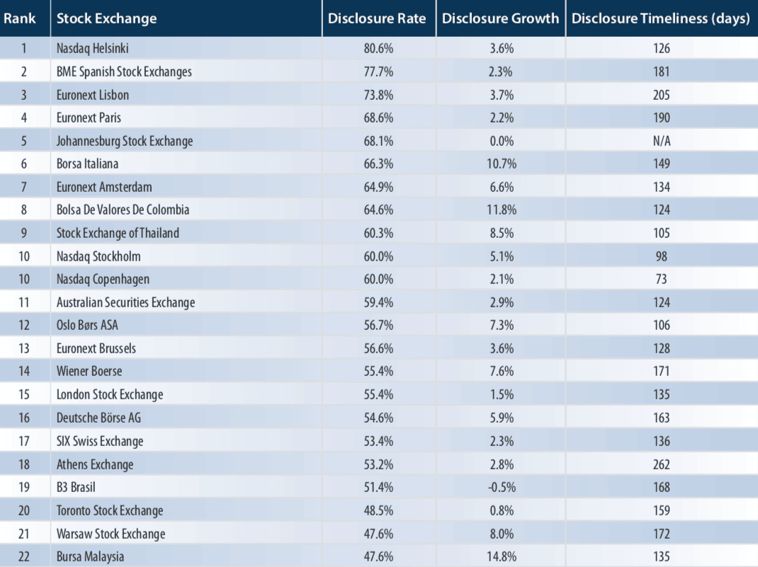 All of the top 10 ranked stock exchanges have mandatory, prescriptive requirements for sustainability disclosure.