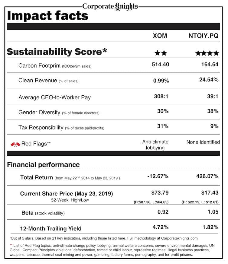 Knowing that many investors want to ditch their shares in Exxon, Corporate Knights’ research team and I started looking for the most sustainable fossil fuel company on the stock market. We found Neste (NTOIY), a Finnish oil refiner that is now redefining what an energy company looks like. Although it still earns most of its revenues from oil refining and gas stations, biofuels like renewable diesel are now the fastest growing part of its business, comprising half its total profits. Its biofuels are made from a combination of waste sources (animal fat and used cooking oil) and plant sources (rapeseed oil and palm oil).