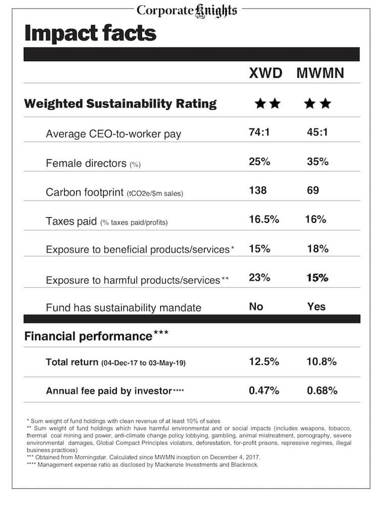 The Mackenzie ETF trumps its benchmark (iShares MSCI World ETF) when it comes to promoting environmental, social and governance issues, with superior scores on average CEO-to-worker pay, gender diversity on boards, and its carbon footprint. Interestingly, the positive gender screen also results in more exposure to companies with products or services that benefit the environment, and less exposure to companies whose products or services have negative impacts like weapons and gambling stocks.