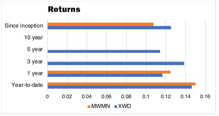 So, how well does the leading fund, Mackenzie Global Leadership Impact ETF (MWMN), hold up against one of the standard ETFs not pre-occupied with gender diversity?