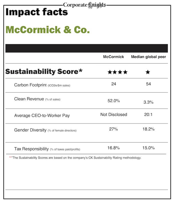 In 2017, McCormick set impressive sustainability goals, such as slashing its greenhouse gas emissions by 20 per cent, sourcing all herbs and spices sustainably, and committing to making 100 per cent of its plastic packaging reusable or recyclable by 2025. The company has a long way to go in meeting these goals, but I’ll give it the benefit of the doubt, since its environmental, social and governance (ESG) scores from the Corporate Knights research arm, as well as MSCI and Sustainalytics, are among the best in its sector. Furthermore, McCormick ranked 22nd on the 2020 Corporate Knights Global 100 Most Sustainable Companies in the World.