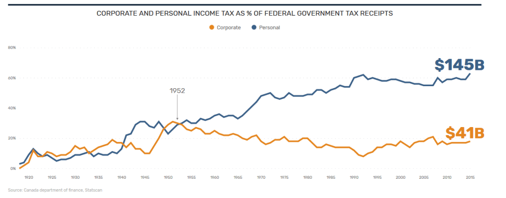 For every dollar corporations pay to the Canadian government in income tax, people pay $3.50. The proportion of the public budget funded by personal income taxes has never been greater.