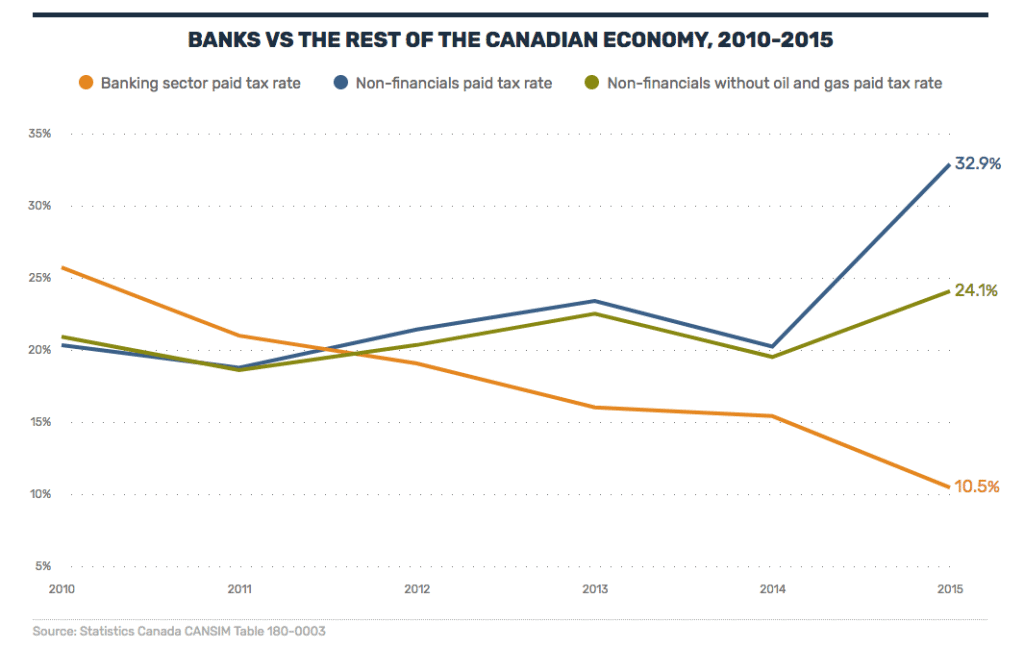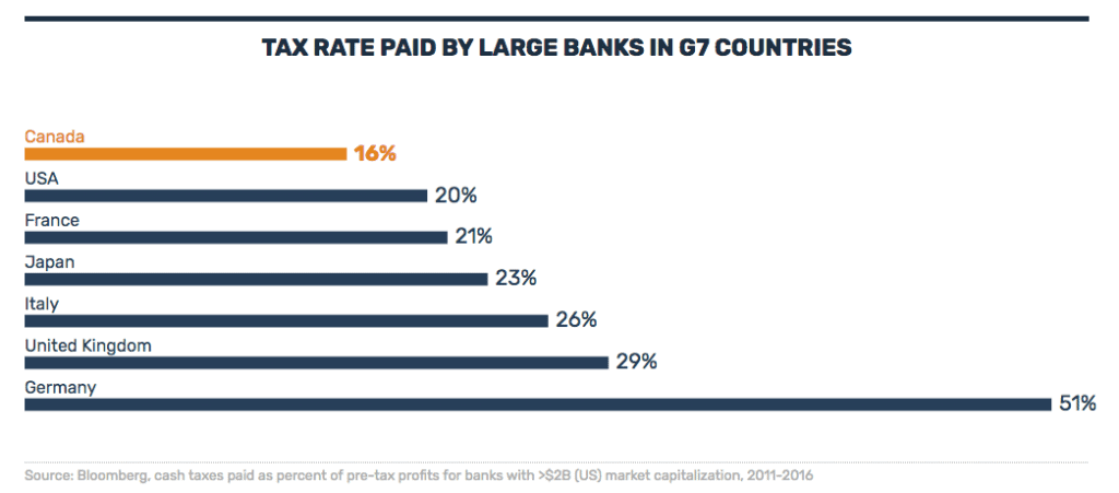 Not only do banks pay a lower tax rate than other companies, Canadian banks pay at a lower rate than banks in other countries.