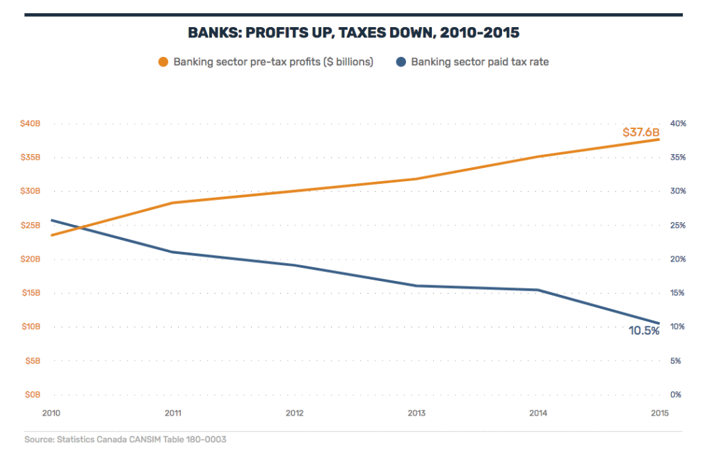 According to Statistics Canada, pre-tax profits in the banking sector as a whole soared by 60 per cent from 2010-2015. During that period, the sector’s tax rate (taxes paid divided by pre-tax profit) has dropped by almost the same amount.