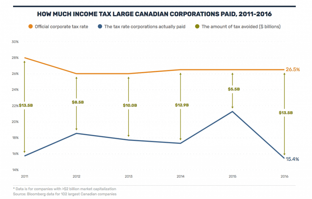 In an average year, the 102 biggest companies in Canada pay $10.5 billion less than they would if they paid tax at the official corporate tax rate.