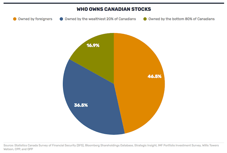 Stockholder data collected by Bloomberg and StatsCan show that more than 80 per cent of Canadian stocks are owned (both directly and indirectly through pensions and mutual funds) by foreigners and the wealthiest households in the country.