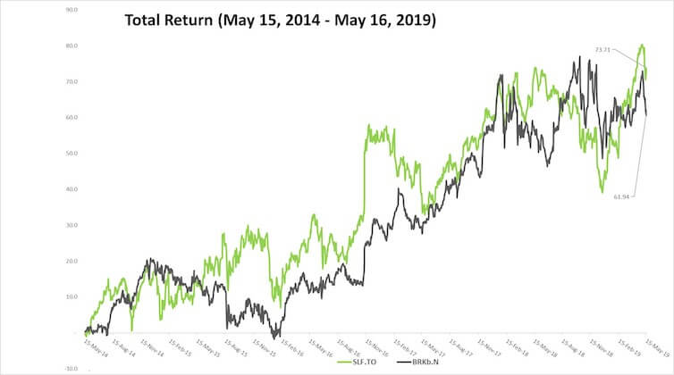Sun Life earns clean revenue points from investments in renewable energy, green bonds and its ownership of Bentall Kennedy – a leader in green buildings. Sun Life’s chief investment officer has publicly spoken about the company’s exposure to climate risks, and I’m curious to see the results of a climate change scenario analysis they’re performing this year. Sun Life still has a long way to go, especially on the integration of sustainability risks into its investment funds, but its performance has been good enough to be named #41 on the Corporate Knights Global 100 list of the world's most sustainable corporations. Over the past five years, Sun Life led investors to more profitable pastures than Berkshire, and as the current bull market cools down, Sun Life’s 3.9% dividend looks pretty against the goose egg offered up by Berkshire. If you’re looking to ditch your Berkshire Hathaway holdings, Sun Life would certainly be a more sustainable pick.