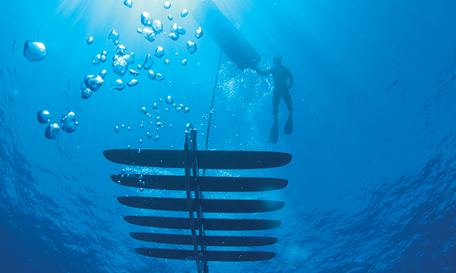 The motion of the waves causes the board to bob up and down in the water – movement that is mimicked below by the glider. The wings and fin on the glider are designed in such a way that the up and down movement is translated into forward thrust. Navigation can be controlled remotely or pre-programmed into the robot.