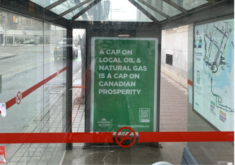 In late 2023 and early 2024, ad campaigns by the Canadian Association of Petroleum Producers and Canada Proud (an allegedly grassroots pro-oil lobby group) were spotted on public buildings throughout the Canadian capital of Ottawa. Ads by these groups have promoted claims that Canadian oil and gas resources are either in high demand or will reduce global emissions.