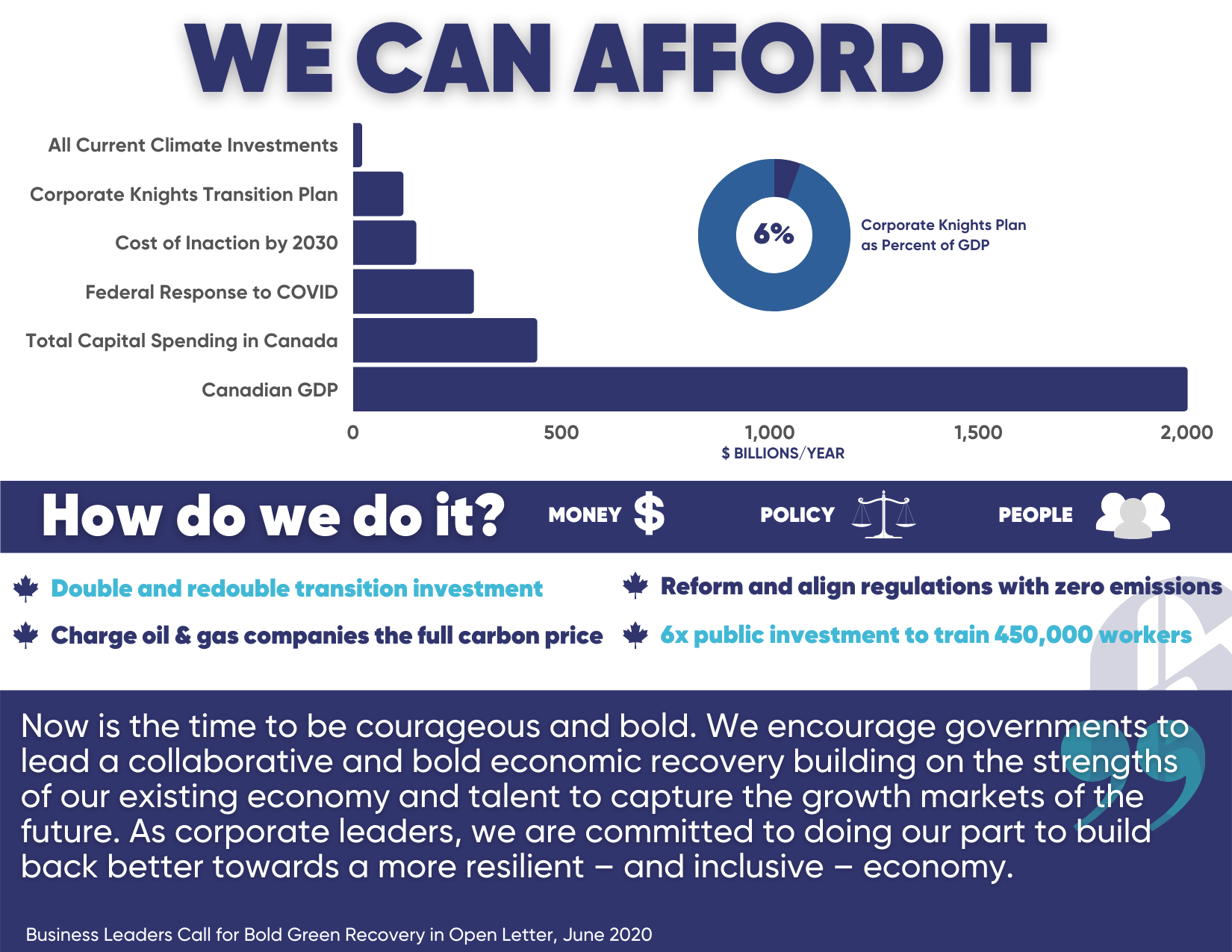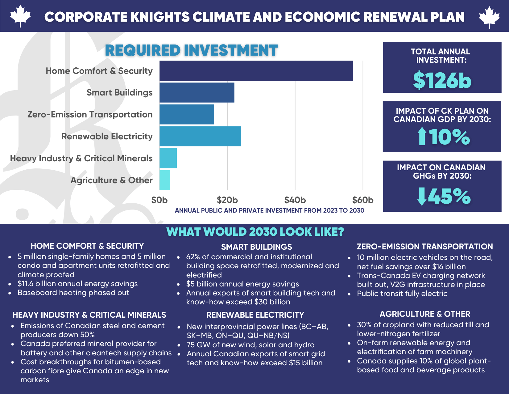 The Corporate Knights Climate and Economic Renewal Plan includes capital investments averaging $126 billion per year over the 2023–2030 period. The federal government estimates the transition will require $125–$140 billion per year, and RBC estimates the transition to net-zero by 2050 will require investments totalling $2 trillion.
